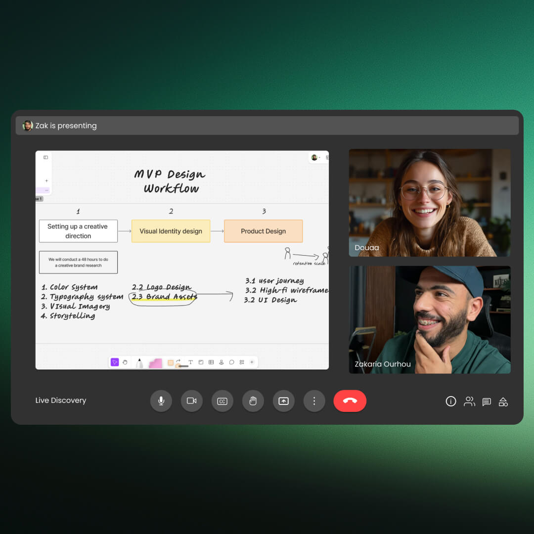 Book a live discovery call where we talk through your project, clarify your goals, and map the key ideas and a tailored workflow live on a whiteboard.